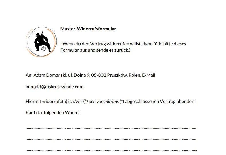 Anmeldung: Sende uns eine kurze E-Mail an kontakt@diskretewinde.com, um uns über deinen Widerruf zu informieren.